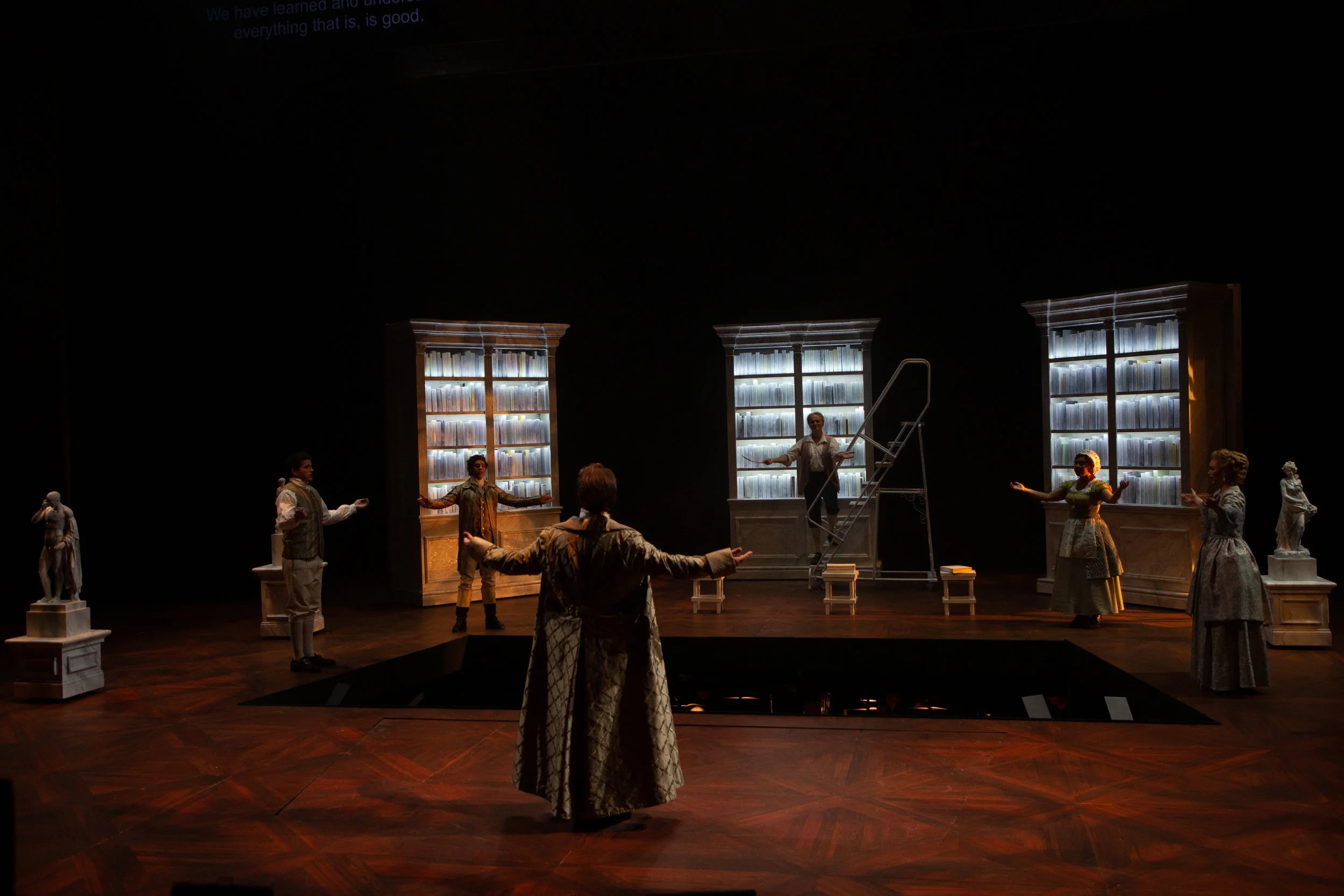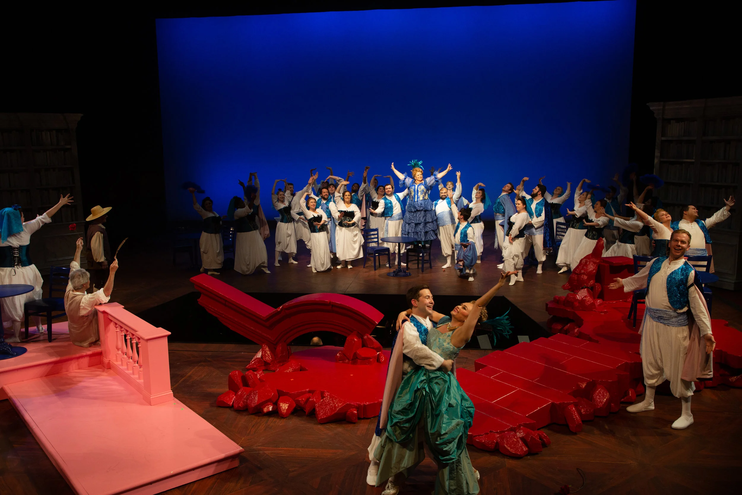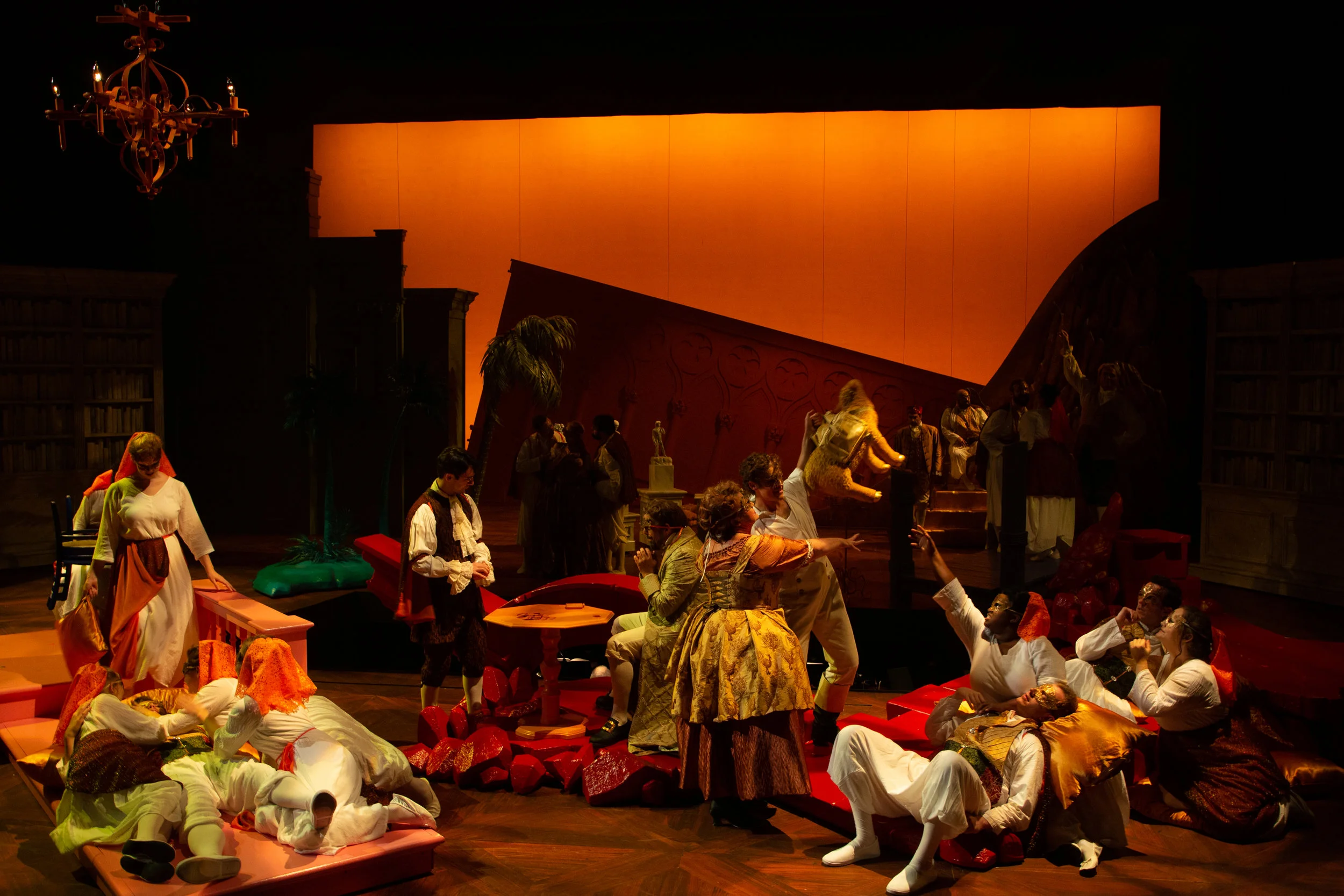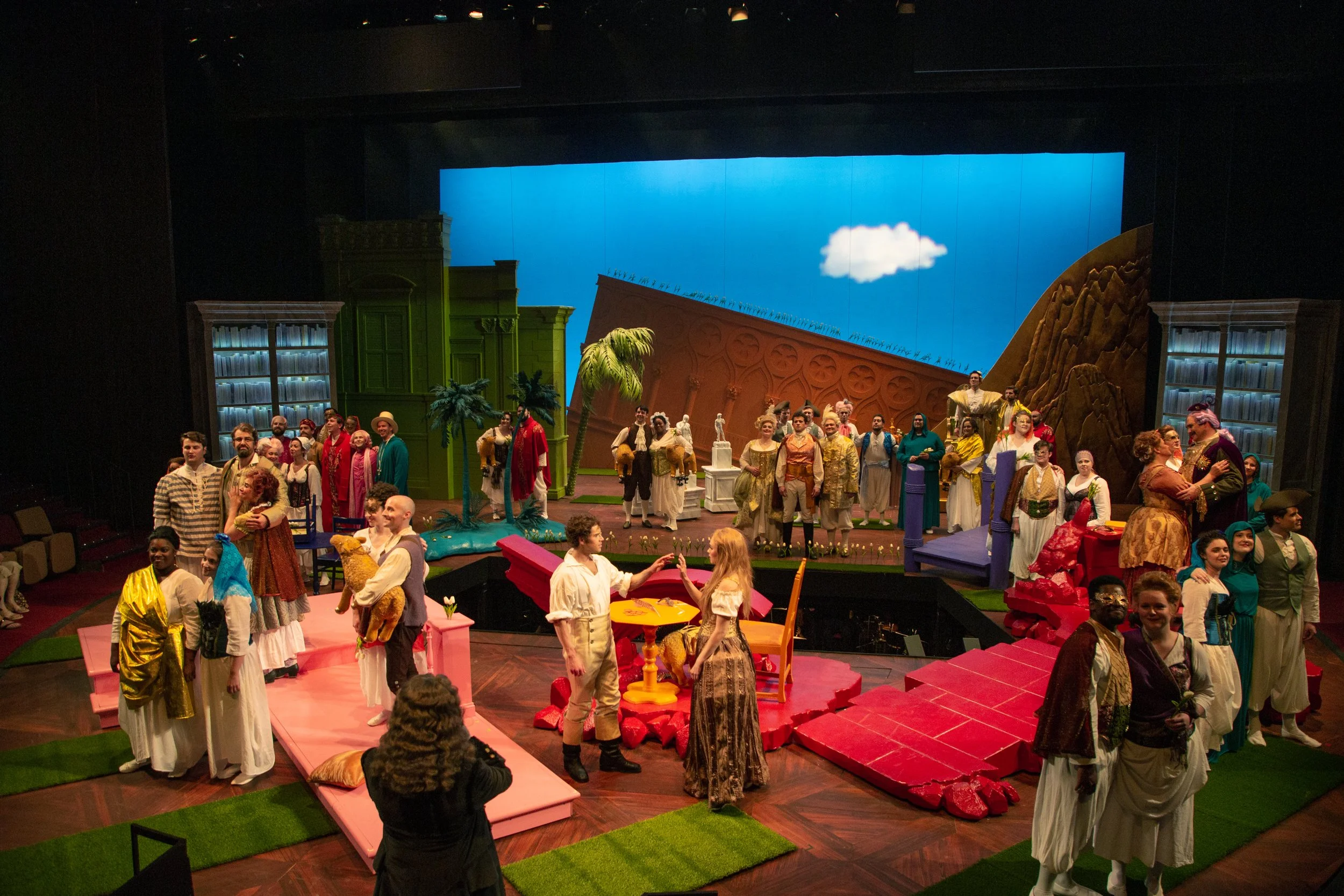 The scenic design by Steven C. Kemp is crucial to making this production concept of a kaleidoscope work. The set became its own character in the show. The set starts with a bare stage with only a wooden floor seen as the audience enters. As the curtain rises on the show we see Westphalia illustrated with the color white. As we continue in the show to each location a new color is introduced to that location. What's unique is that as we continue to each location, something stays on stage. So something white stays on stage the full show as other pieces are brought on. Some pieces were large pieces, others were small, but each color was impactful and reminded you of what Candide has seen and learned on his journey. What surprises me the most is that I could still tell you some of the colors and what region of the world they represented. To me that speaks volumes to the set design