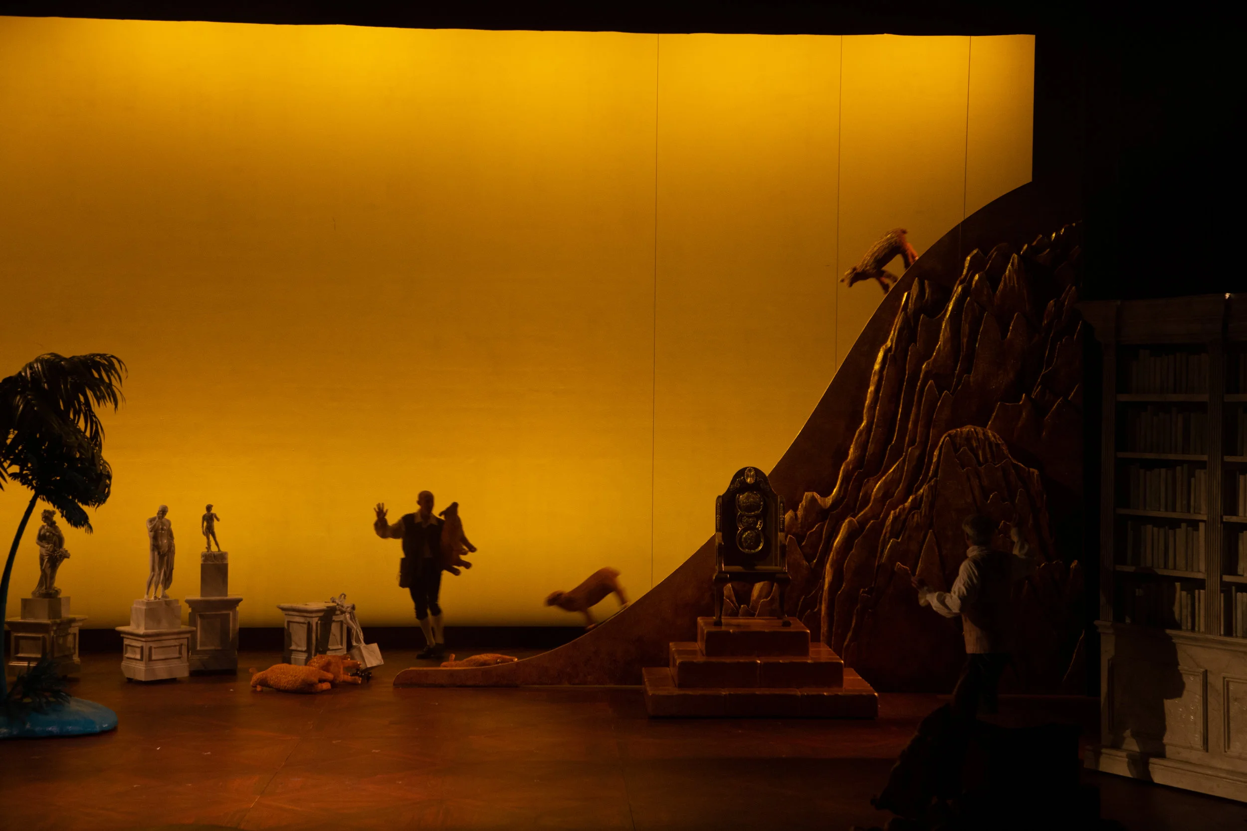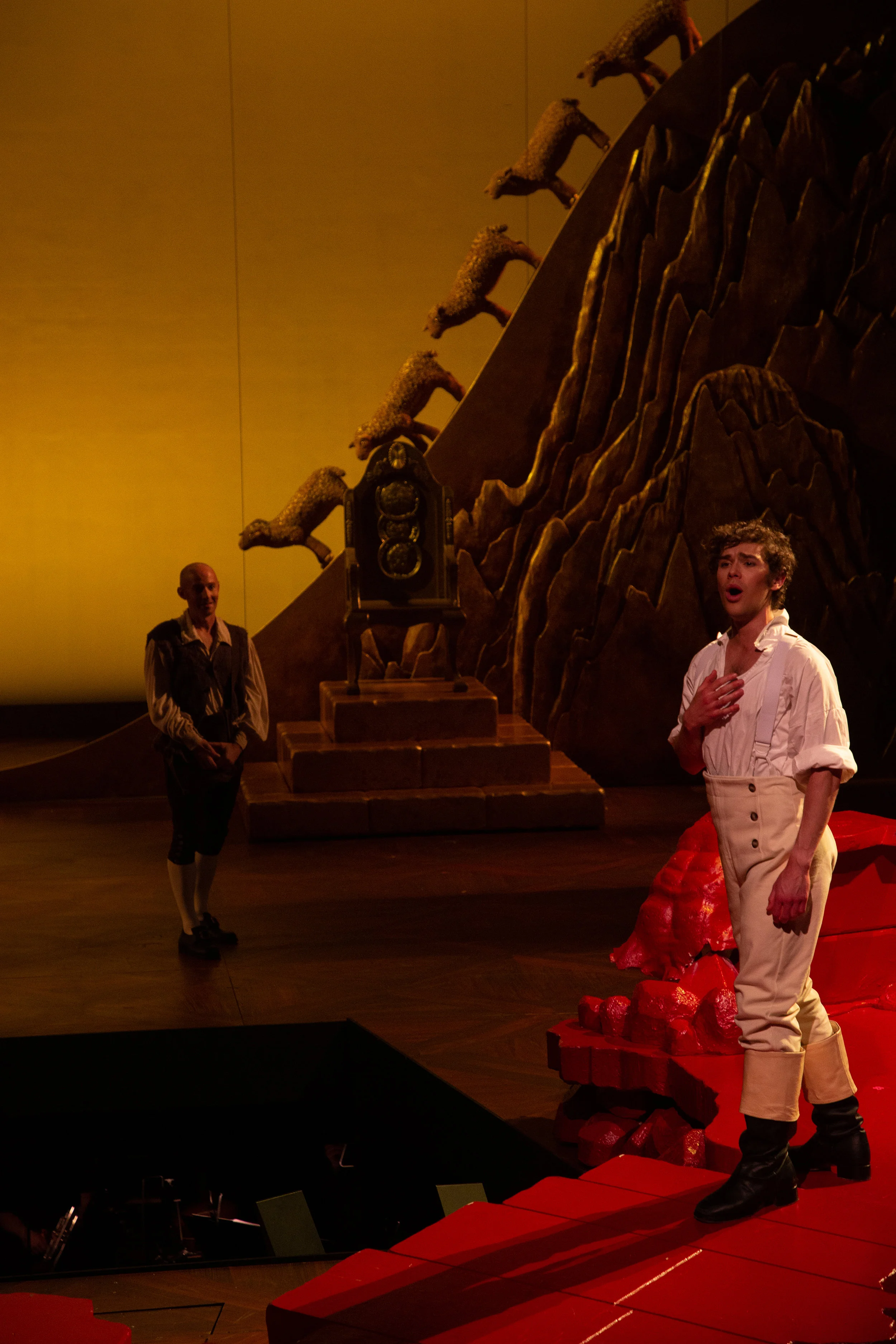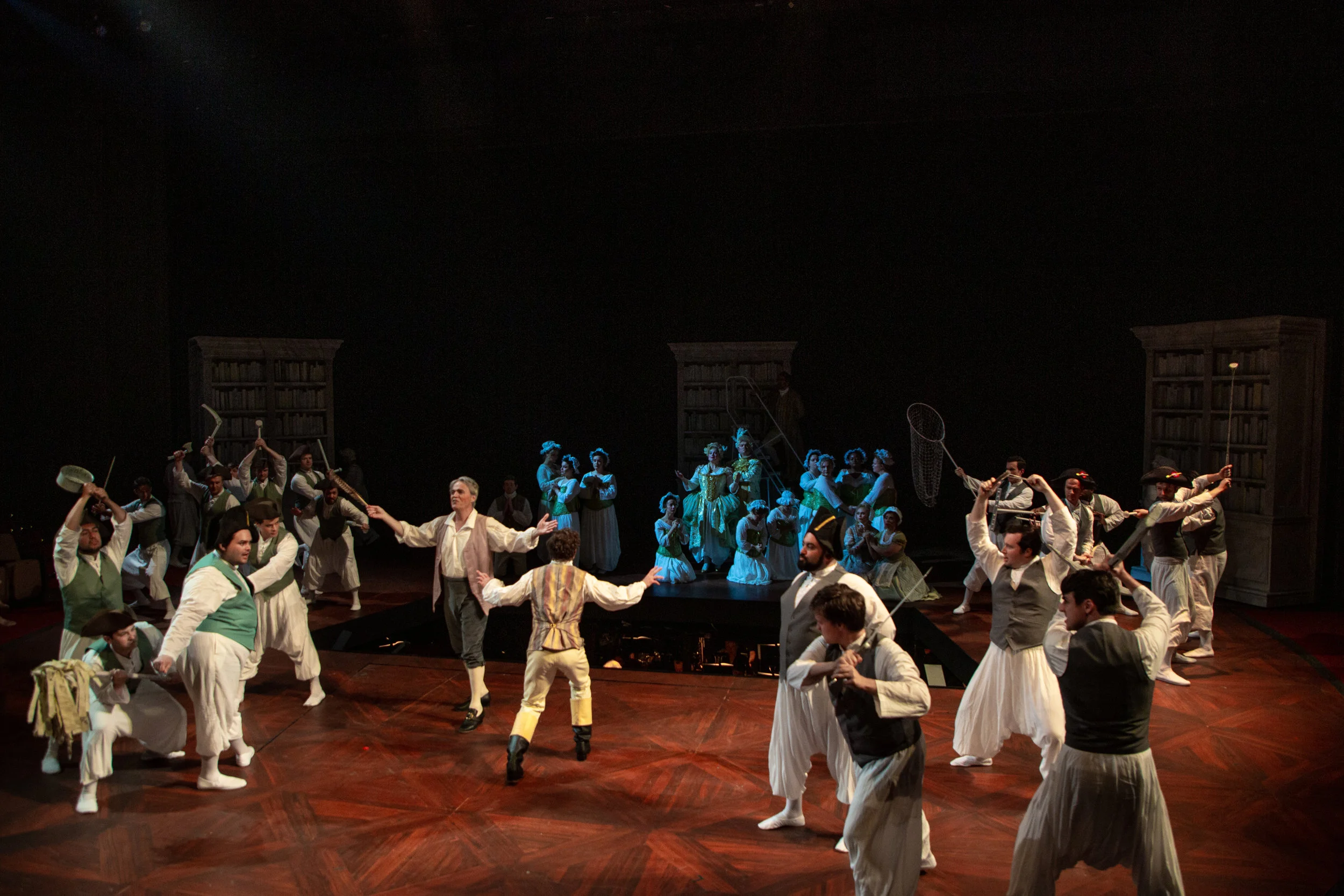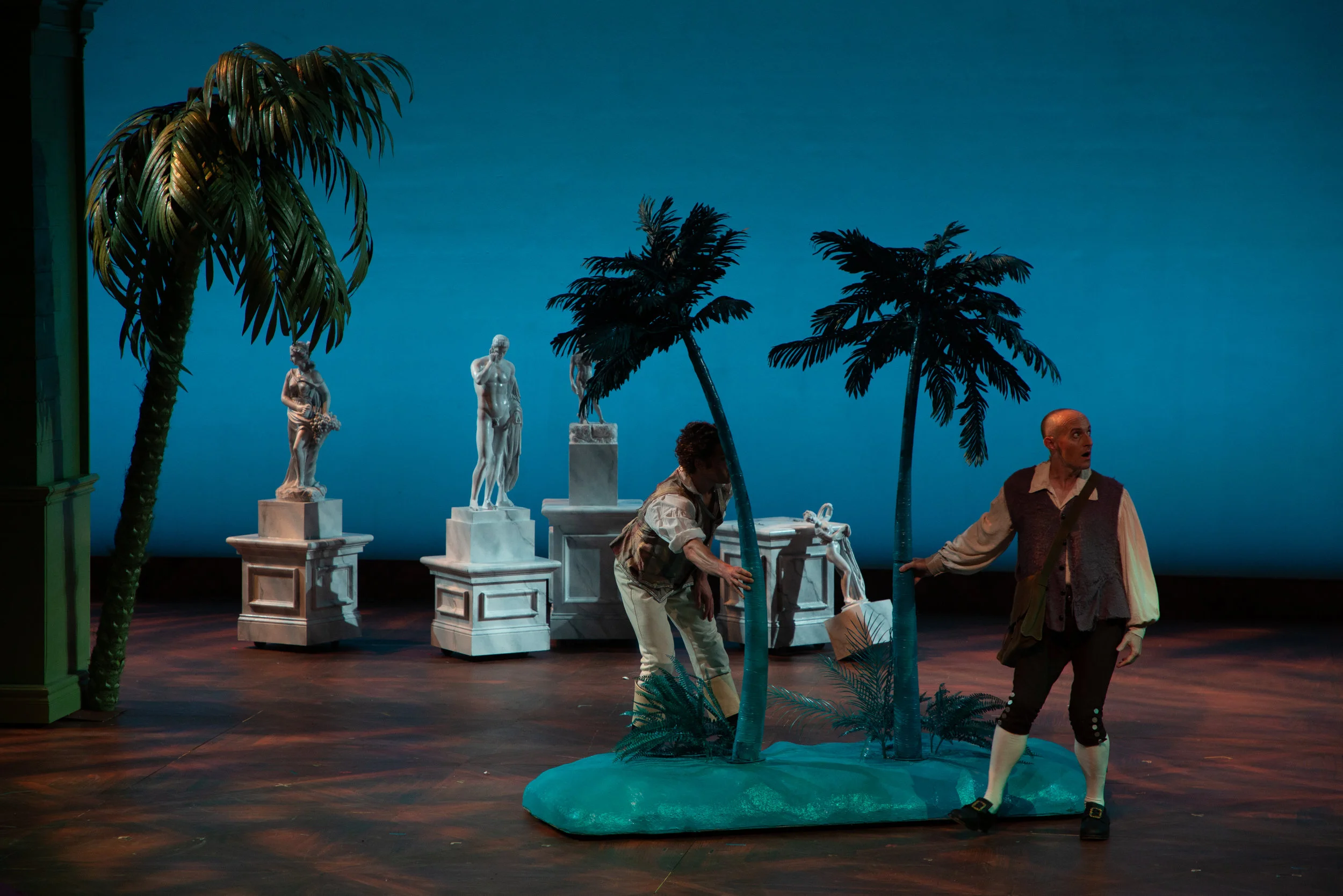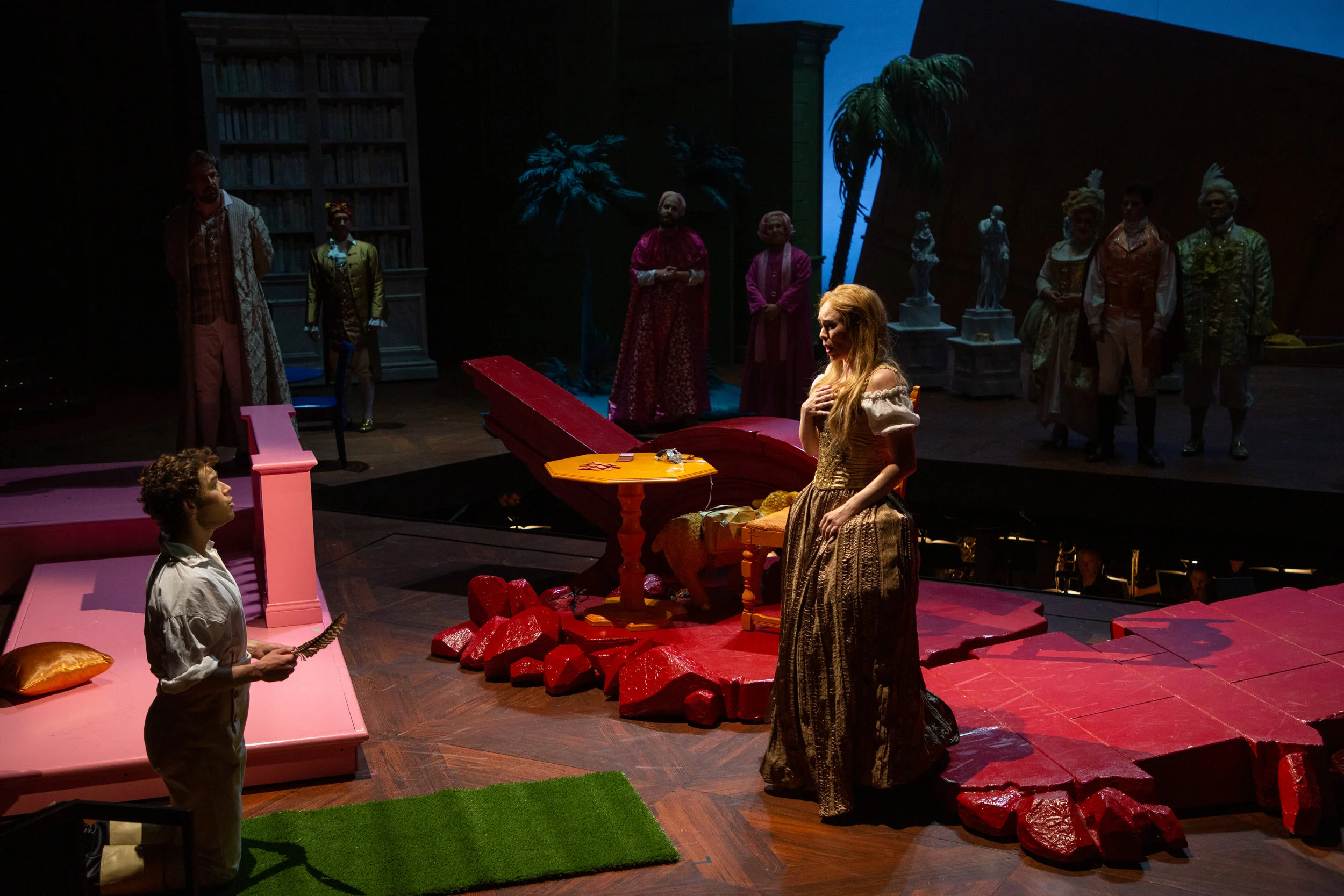 The scenic design by Steven C. Kemp is crucial to making this production concept of a kaleidoscope work. The set became its own character in the show. The set starts with a bare stage with only a wooden floor seen as the audience enters. As the curtain rises on the show we see Westphalia illustrated with the color white. As we continue in the show to each location a new color is introduced to that location. What's unique is that as we continue to each location, something stays on stage. So something white stays on stage the full show as other pieces are brought on. Some pieces were large pieces, others were small, but each color was impactful and reminded you of what Candide has seen and learned on his journey. What surprises me the most is that I could still tell you some of the colors and what region of the world they represented. To me that speaks volumes to the set design
