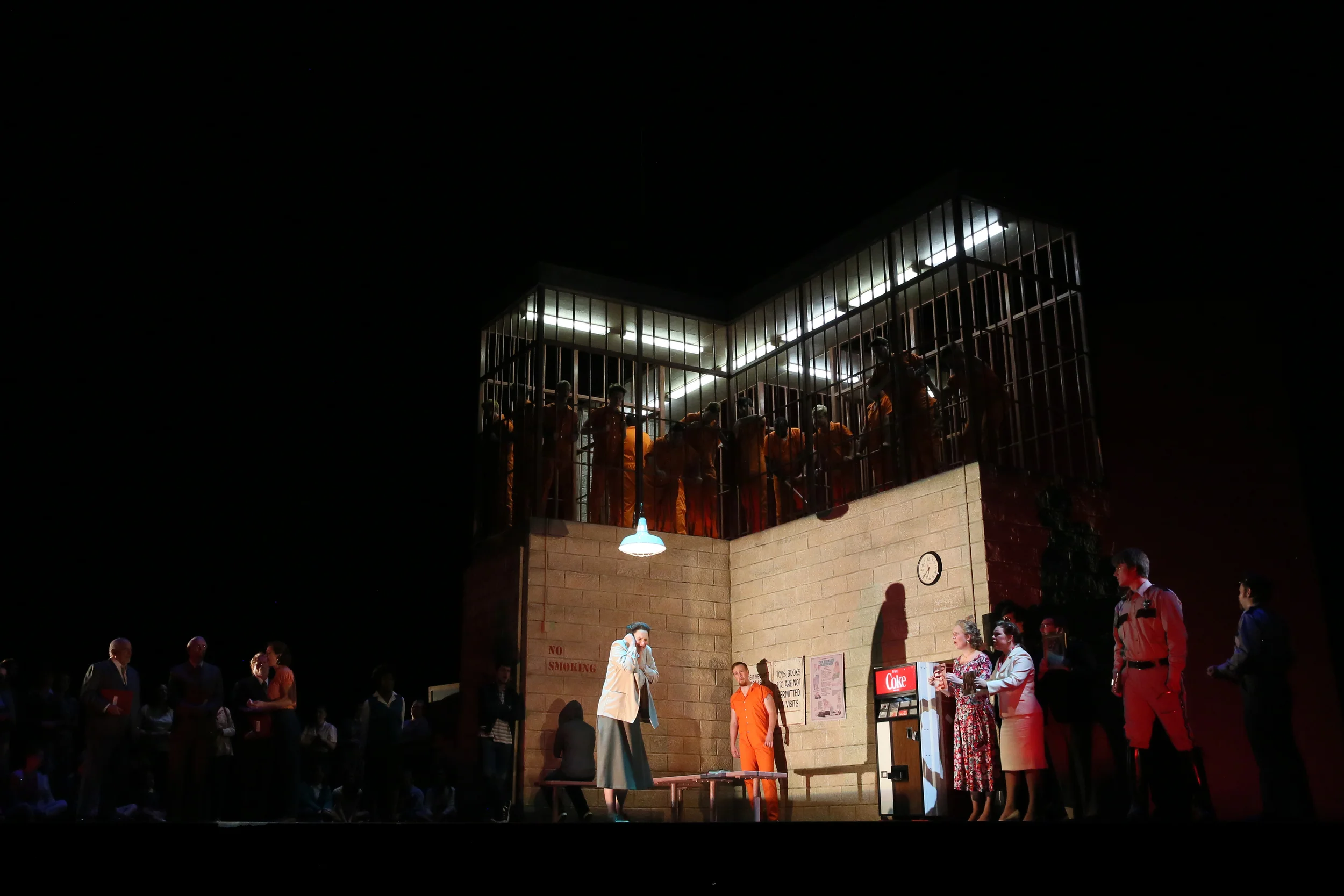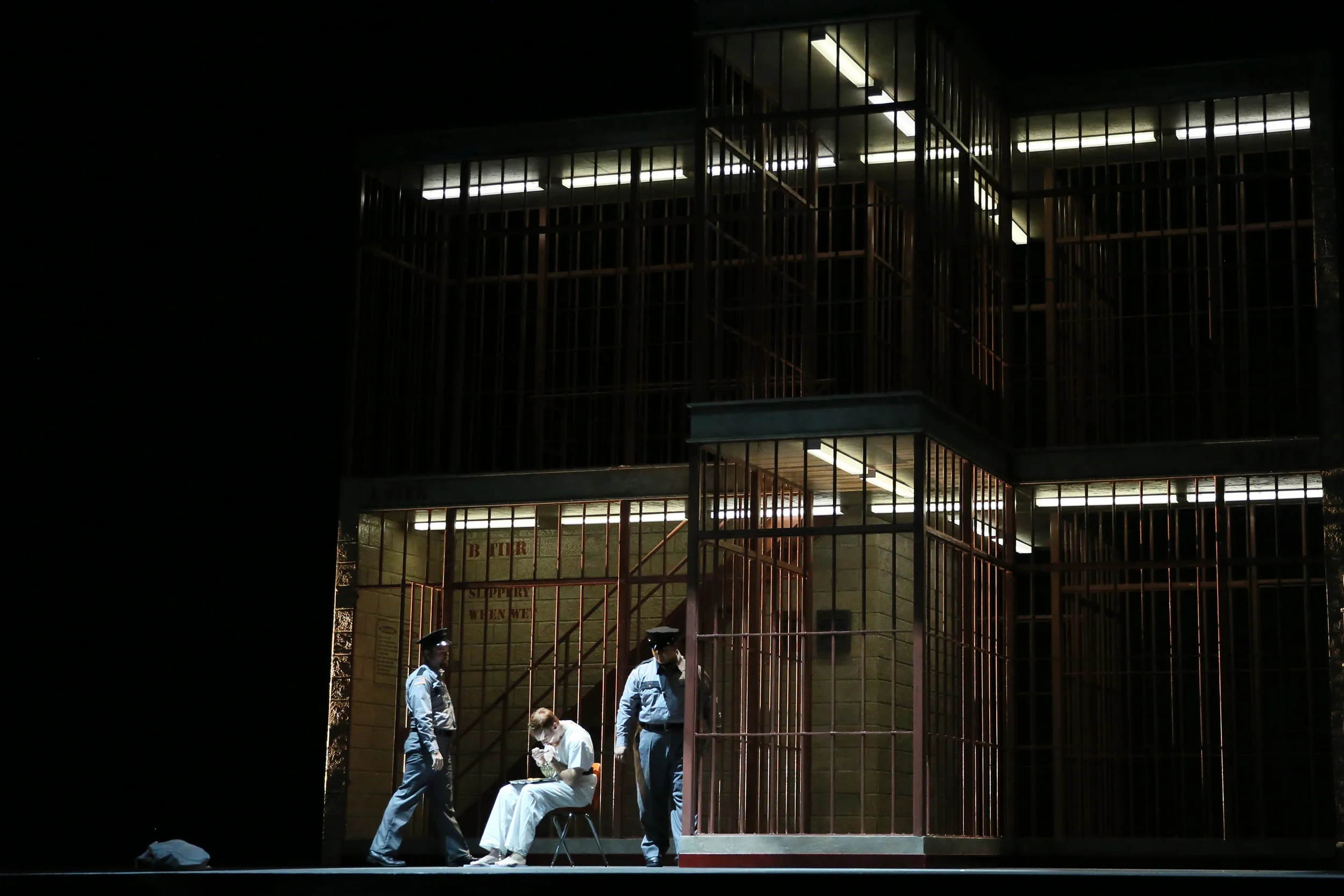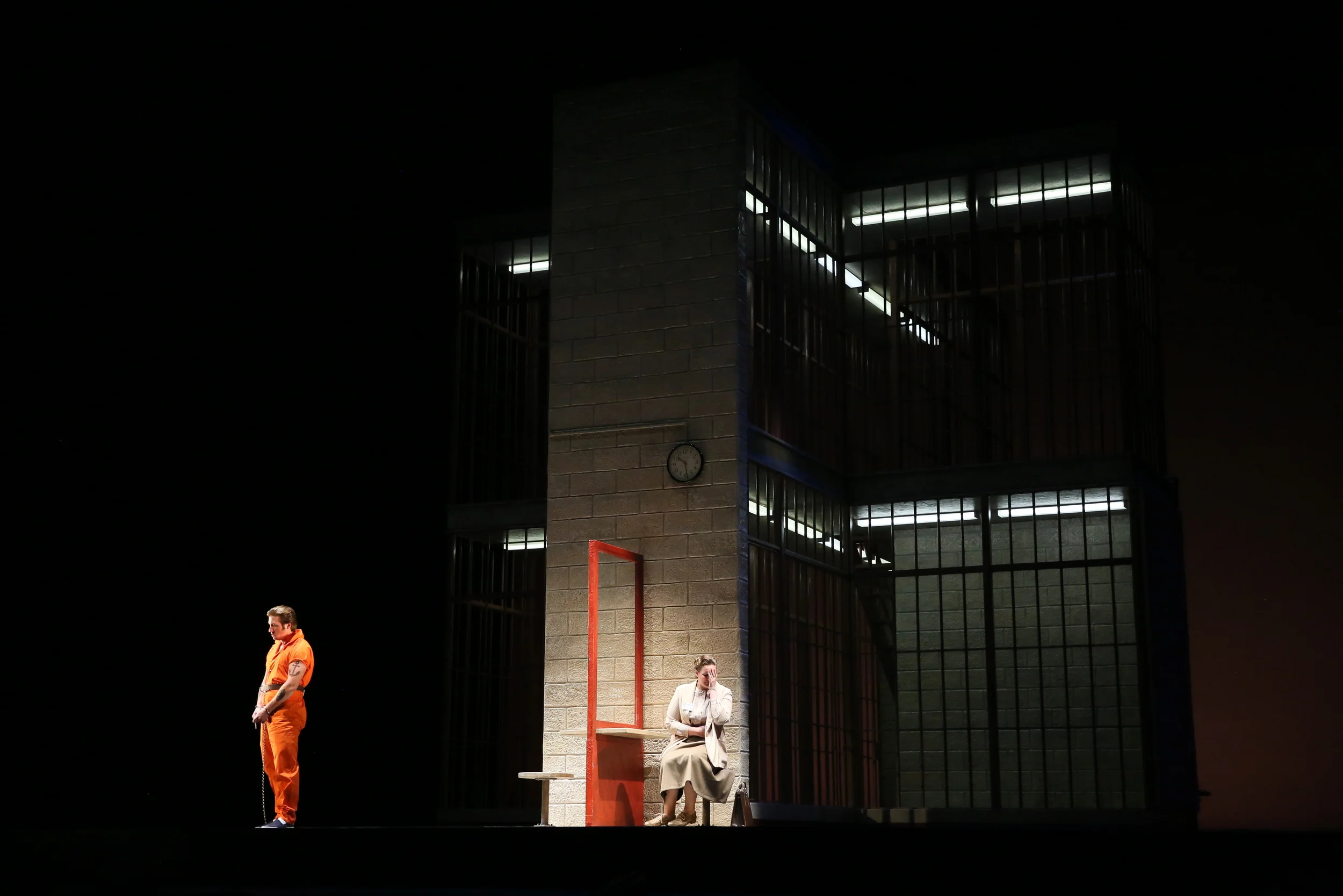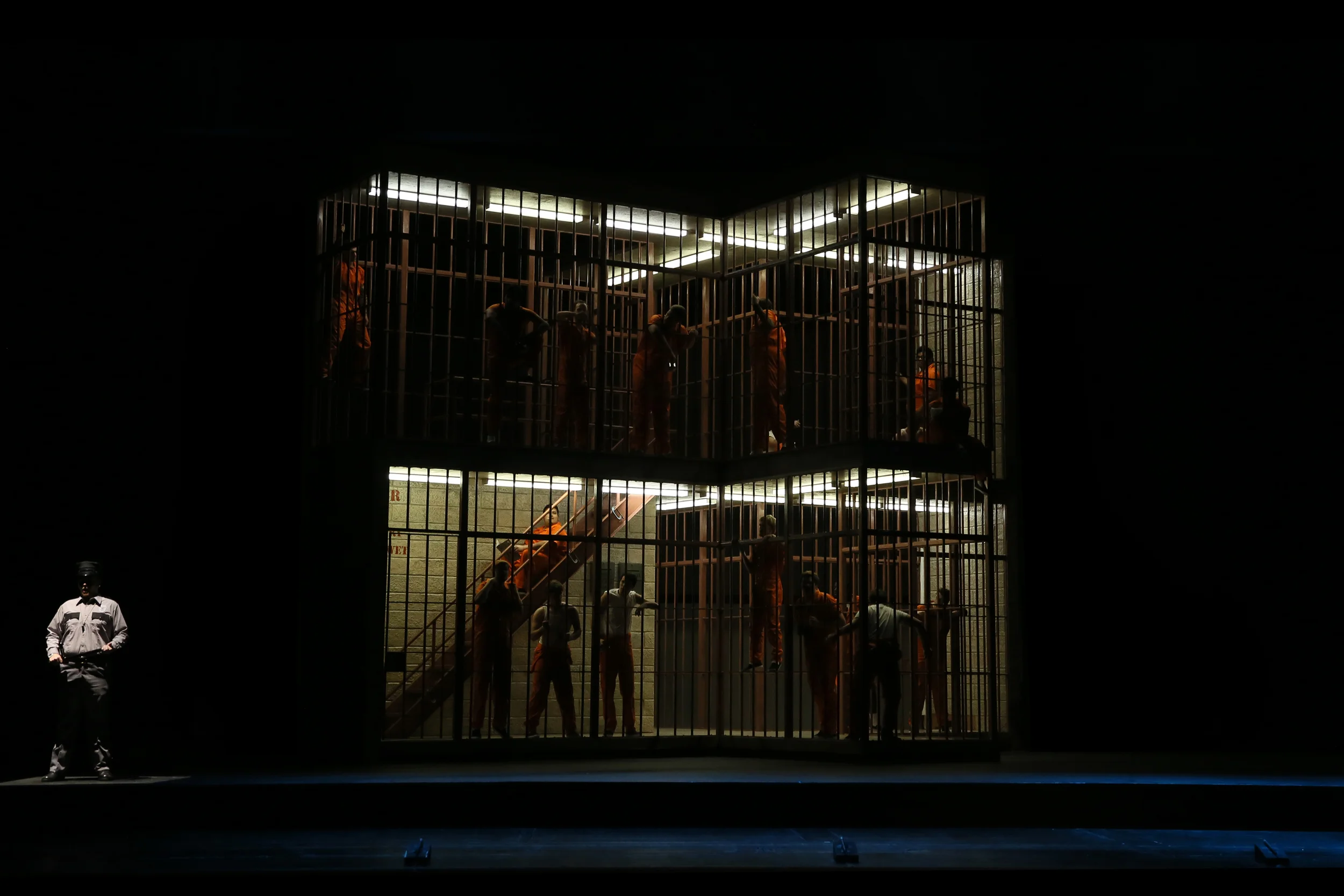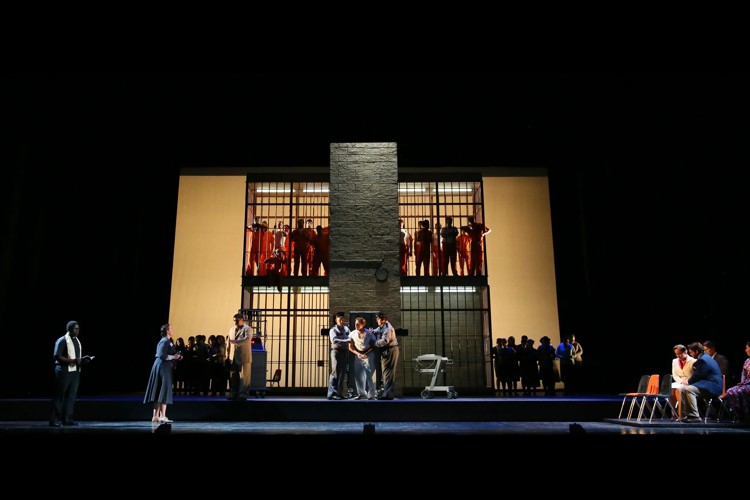 IU Opera Theater’s current account holds blockbuster strengths.A turntable set focused primarily on the penitentiary smoothly revolves from scene to scene so that the performance can move forward without pauses. Visiting designer Steven Kemp, with minimal scenic additions, chose to have the turntable center become the opera’s world, and an impactful choice that was.